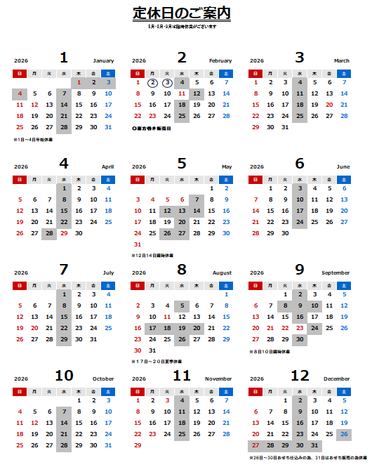 誠に勝手ながら、12月27日(火)~1月4日(水)の期間を休業とさせて頂きます。